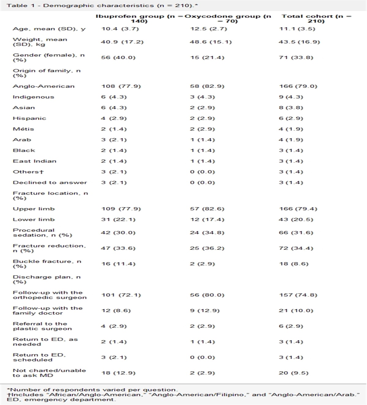 Table 1 - Demographic characteristics (n = 210).* Ibuprofen group (n = 140) Oxycodone group (n = 70) Total cohort (n = 210) Age, mean (SD), y 10.4 (3.7) 12.5 (2.7) 11.1 (3.5) Weight, mean (SD), kg 40.9 (17.2) 48.6 (15.1) 43.5 (16.9) Gender (female), n (%) 56 (40.0) 15 (21.4) 71 (33.8) Origin of family, n (%) Anglo-American 108 (77.9) 58 (82.9) 166 (79.0) Indigenous 6 (4.3) 3 (4.3) 9 (4.3) Asian 6 (4.3) 2 (2.9) 8 (3.8) Hispanic 4 (2.9) 2 (2.9) 6 (2.9) Métis 2 (1.4) 2 (2.9) 4 (1.9) Arab 3 (2.1) 1 (1.4) 4 (1.9) Black 2 (1.4) 1 (1.4) 3 (1.4) East Indian 2 (1.4) 1 (1.4) 3 (1.4) Others† 3 (2.1) 0 (0.0) 3 (1.4) Declined to answer 3 (2.1) 0 (0.0) 3 (1.4) Fracture location, n (%) Upper limb 109 (77.9) 57 (82.6) 166 (79.4) Lower limb 31 (22.1) 12 (17.4) 43 (20.5) Procedural sedation, n (%) 42 (30.0) 24 (34.8) 66 (31.6) Fracture reduction, n (%) 47 (33.6) 25 (36.2) 72 (34.4) Buckle fracture, n (%) 16 (11.4) 2 (2.9) 18 (8.6) Discharge plan, n (%) Follow-up with the orthopedic surgeon 101 (72.1) 56 (80.0) 157 (74.8) Follow-up with the family doctor 12 (8.6) 9 (12.9) 21 (10.0) Referral to the plastic surgeon 4 (2.9) 2 (2.9) 6 (2.9) Return to ED, as needed 2 (1.4) 1 (1.4) 3 (1.4) Return to ED, scheduled 3 (2.1) 0 (0.0) 3 (1.4) Not charted/unable to ask MD 18 (12.9) 2 (2.9) 20 (9.5)*Number of respondents varied per question.
