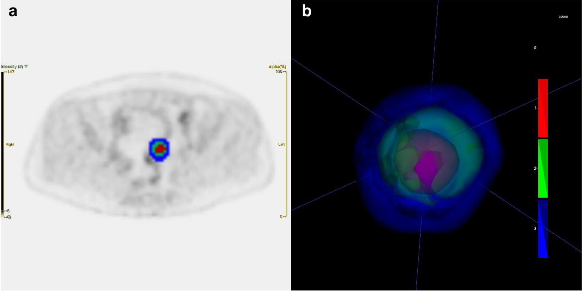 Imaging method and image analysisThe 2-[18F] FDG radiotracer was prepared using a cyclotron (Sumitomo Heavy Industries, Ltd. Tokyo, Japan) automated synthesis module, with radiochemical purity > 95% and pH 4–8. Patients were injected with 5.5–6.6 MBq/kg (0.1 mCi/kg) of 2-[18F] FDG under the premise of fasting for at least 6 hours and plasma glucose of less than 11.1 mmol/L. One hour later, the bladder was emptied and then PET/CT images were collected. 2-[18F] FDG PET/CT was performed on a GE Discovery VCT PET/CT scanner, with the scanning range from the skull base to the mid-thigh level. A CT scan (scanning parameters: slice thickness 5 mm, tube current 110 mA, tube voltage 120 kV, frame rotation speed 0.7 r/s, bed speed 29.46 cm/s, matrix 512 × 512) was done first, followed by a PET scan (scanning parameters: matrix 128 × 128, 8–9 bed positions, 1.5–3.0 min/bed position). CT and PET images, which were reconstructed with decay correction and ordered subset expectation maximization (OSEM) algorithms were fused and reviewed on a Xeleris workstation. In addition, all patients involved underwent deep-inspiration breath-hold chest thin-slice CT scan (scanning parameters: layer thickness 1.25 mm, matrix 512 × 512); preset lung window (window width 1200 Hounsfield units (HU), window level − 700 HU).