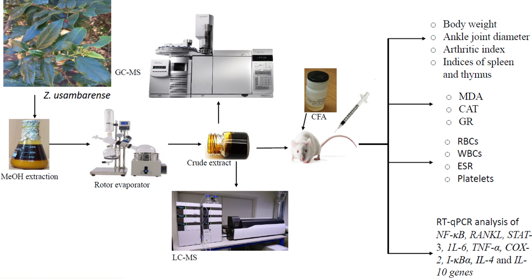 Collagen Type II (COL2) (Cat. # MBS2702065, MyBioSource, Inc., CA, USA), Cartilage oligomeric matrix protein (COMP) (Cat. # MBS267386, MyBioSource, Inc., CA, USA) and C reactive protein (CRP) (Cat. # SCA821Ra, CLOUD-CLONE CORP., TX, USA) were detected in serum samples using ELISA kits as per the instructions of the manufacturer. Thermo Scientific Pierce BCA Protein Assay Kit (Cat. # 23,225 and 23,227, Thermo Fisher Scientific Inc., Massachusetts, USA) was used to detect and quantify total protein colorimetrically. Protein kinase B (AKT1) (Cat. # LS-F49321, LifeSpan BioSciences, Inc., MA, USA), phosphotylinosital 3 kinase (PI3K) (Cat. # MBS260381, MyBioSource, Inc., CA, USA), signal transducer and activator of transcription 3 (STAT3) (Cat. # MBS2515874, MyBioSource, Inc., CA, USA) and interleukin-6 (IL-6) (Cat. # SEA079Ra, CLOUD-CLONE CORP., TX, USA) were detected in tissue homogenates using ELISA kits as per the instructions of the manufacturer.