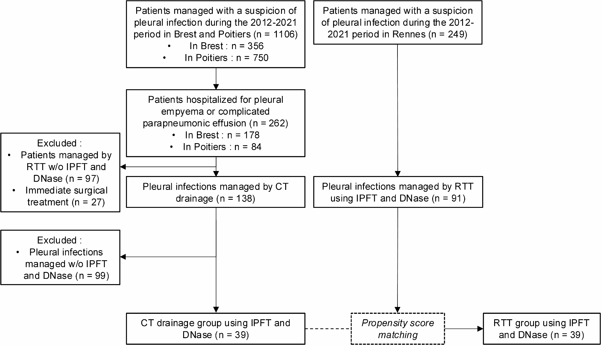 Propensity-score matched populationOne hundred and thirty patients fulfilled criteria of pleural infection managed by pleural drainage and receiving IPFT plus intrapleural DNase in the three participating centers. After matching, 78 patients were included in the final analysis, divided in two groups of 39 patients each (Fig. 1). One group received IPFT plus DNase through CT (CTD group), and the other group was managed using RTT with at least one instillation of urokinase plus DNase (RTT group).