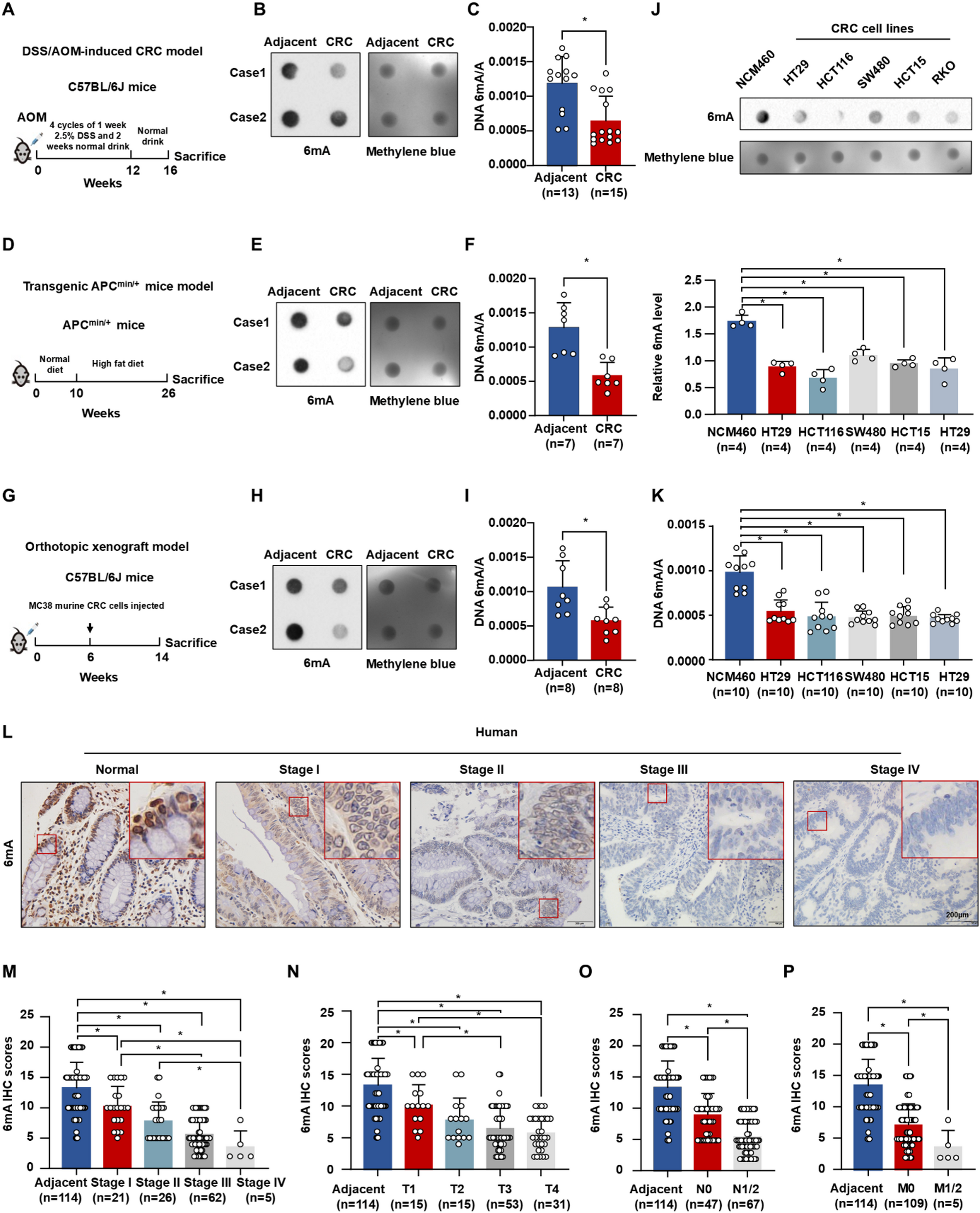 6 mA ELISAGenomic DNA was extracted from human and murine CRC specimens, as well as cultured cell lines, using the QIAamp DNA Mini Kit from Qiagen. DNA 6 mA methylation levels were quantified using the Methyl Flash 6 mA DNA Methylation ELISA Kit (Colorimetric) following the manufacturer’s instructions. The methylated fraction of 0.1 ug DNA was recognized by a 6 mA antibody and quantified via an ELISA-like reaction. The percentage of 6 mA (6 mA%) was calculated from the optical density (OD) value using the provided formula. Methylated and unmethylated DNA served as positive and negative controls, respectively.