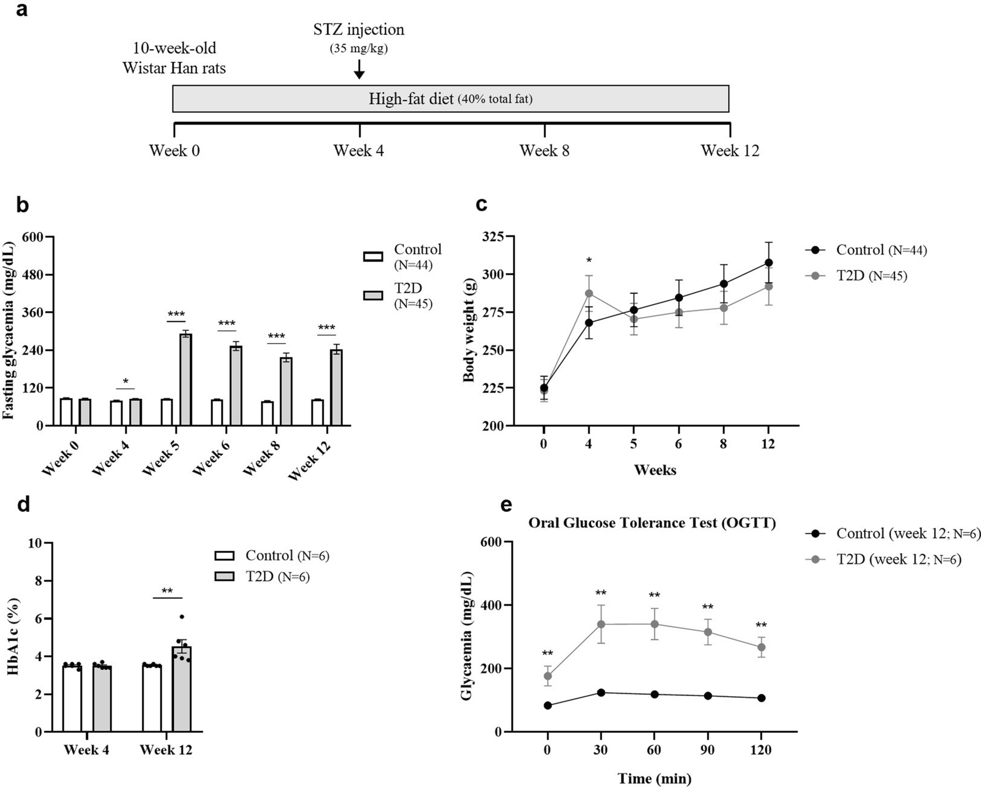 In this study, we induced type 1 diabetes in mice via the intraperitoneal injection of STZ. After induction, compared with age-matched controls, STZ-injected mice exhibited a persistent hyperglycemic state (Fig. 1A) and lost a significant amount of body weight (Fig. 1B); moreover, corneal sensitivity was significantly reduced (Fig. 1C), and corneal epithelial wound healing was significantly delayed (Fig. 1D), confirming that diabetic mice develop corneal neuropathy and delays in corneal epithelial wound healing.