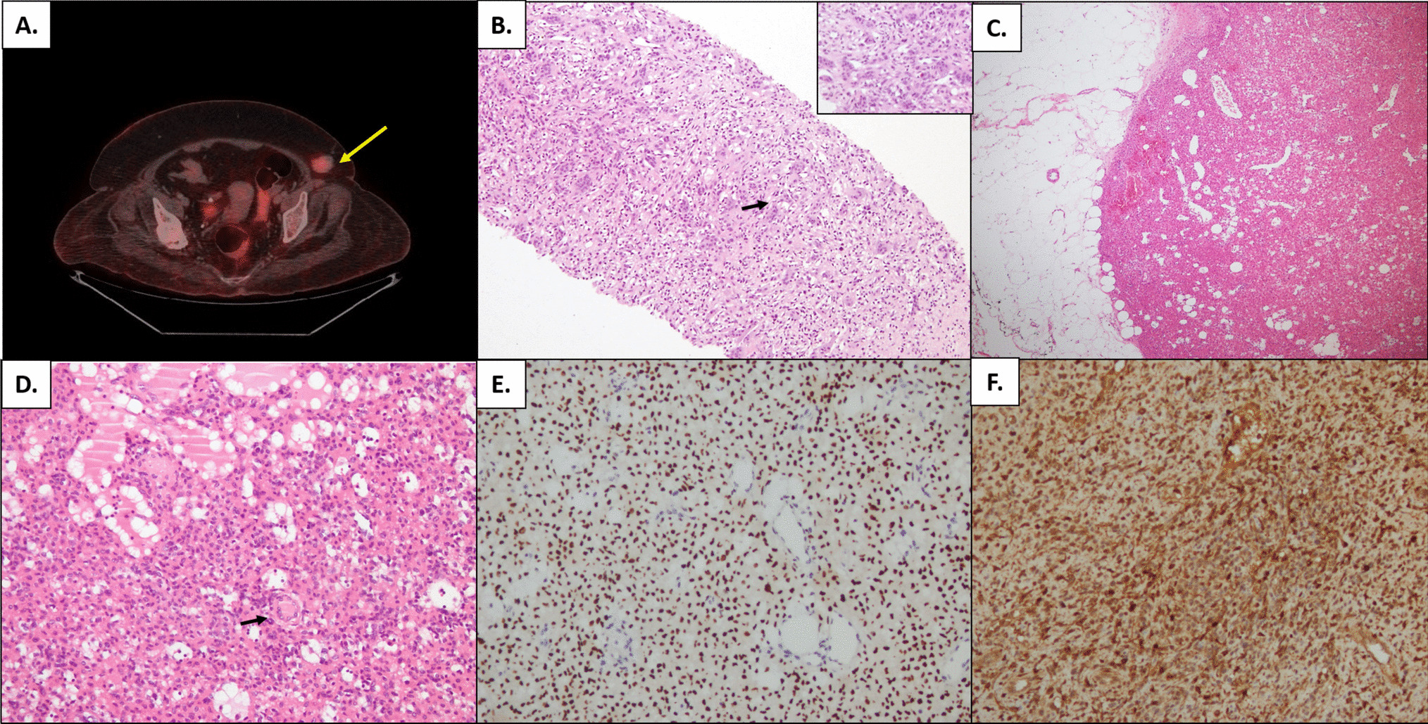 We identified 179 patients with SFT registered at our center for the said duration, of which 111 patients (62%) were extra-thoracic SFTs. Out of this 22 patients (19.8%) who had underwent surgical resection formed the cohort of patients for the study. The median age at presentation was 54 years (range 25 to 75 years). There were 14 male (63.6%) and 8 female (36.4%) patients which included 15 patients with abdominopelvic SFTs, 5 patients with extremity SFTs, and 2 patients with extra-meningeal head and neck SFTs. Patients were initially evaluated with a contrast-enhanced computed tomography (CECT) scan. SFTs are characterized as well-circumscribed soft tissue masses that enhance avidly indicating their vascular nature with smaller lesions being more homogenously enhancing and larger lesions having a central low attenuation area due to necrotic changes (Fig. 1). In extremities, pelvic and orbital SFTs, magnetic resonance imaging (MRI) was done and all cases had demonstrated the characteristic black-and-white-mixed pattern in T2-weighted sequences (Fig. 1). Radiological features although not diagnostic often helped to point towards the diagnosis (11). Preoperative biopsy was done in 16 patients. Surgical morbidity with the Clavien-Dindo Grade 3 or more complications were encountered in 2 patients (9.1%) with both these patients requiring re-exploration due to bowel related complications. Microscopically margin negative resection was achieved in 18 of patients (81.8%) and node positive disease was reported in 1 patient. The median size of tumor in the largest dimension was 12 cm (range: 3 to 30 cm). All cases were diagnosed by their characteristic appearance and CD34 and/or STAT6 expression (5). Immunohistochemical (IHC) markers for STAT6 were positive in all 8 out of 8 patients that were tested. IHC for CD34 was positive in 19 out of 22 in which it was done; BCL2 was positive in 7 out of 9 patients and S100 in 3 out of 17 patients in which they were done. NAB2-STAT6 fusion testing though gold standard was not performed in any patients due to logistic constraints (Fig. 2).