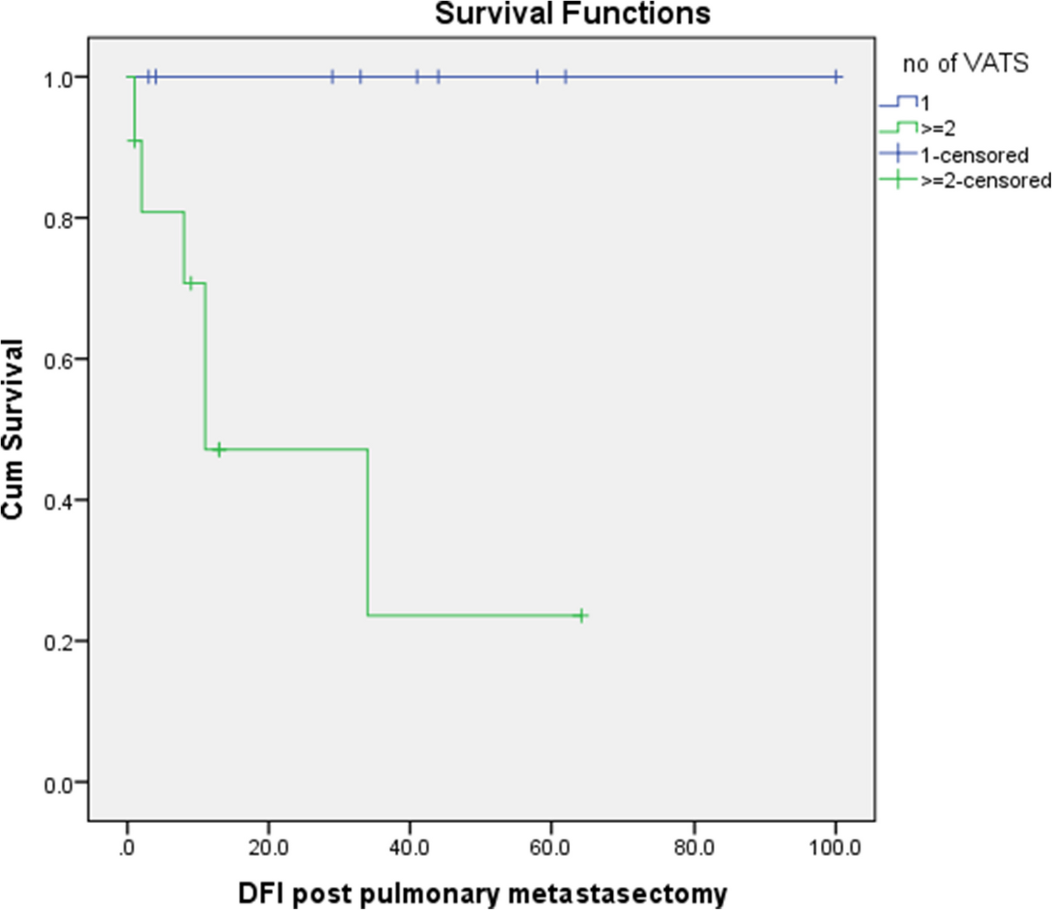 The median follow-up duration was 54 months (4 to 162 months). Four patients developed recurrences with three of them occurring after 50 months. Salvage treatment was attempted in all patients at the time of recurrence as they had good performance status, DFI more than 24 months and were single site recurrences. Salvage with systemic chemotherapy was attempted for three patients with lung metastasis with ifosfamide-adriamycin used as first line. Salvage radiation was offered to one patient with bone relapse. Median survival after recurrence was 10.5 months, and all patients who recurred died due to disease progression. The median DFS and OS were not reached for the cohort. The five-year DFS and OS were 80% and 80%, respectively.