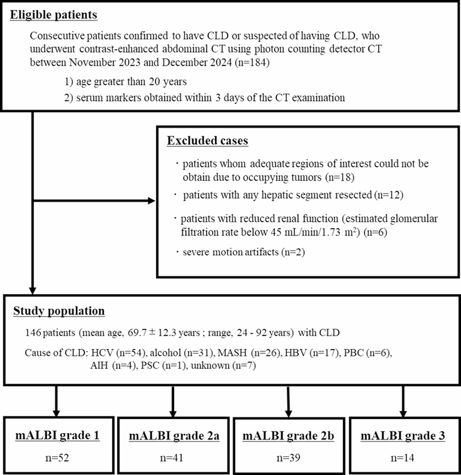 Although studies on fECV measurement using PCD-CT are currently limited due to its recent clinical introduction, our study successfully performed detailed segmental fECV analysis using this technology. The correlation strength and stratification capability observed between PCD-CT-derived fECV and mALBI grade in our study were comparable to those reported in previous DECT studies [4]. While specific imaging parameters and equilibrium phase timing differed from prior research, the accuracy of hepatic iodine quantification in the equilibrium phase appears similar between DECT and PCD-CT. However, PCD-CT provides notable workflow benefits, facilitating straightforward fECV calculation within routine clinical practice. Additionally, the inherent lower noise characteristics of PCD-CT, particularly relevant at potentially lower doses used in clinical practice, likely contribute to the accurate calculation of fECV. While a prior study by Ozaki et al. demonstrated segmental fECV differences in chronic liver disease using 5-minute delayed DECT [4], our study expands this framework by incorporating PCD-CT with a shorter (3-minute) equilibrium phase. This approach not only reflects practical imaging work-flows but also enables retrospective spectral reconstruction, allowing flexible application without protocol modification. Moreover, by investigating the prognostic impact of segment-specific fECV on future mALBI grade deterioration, our study provides novel insight that was not addressed in previous DECT-based evaluations.