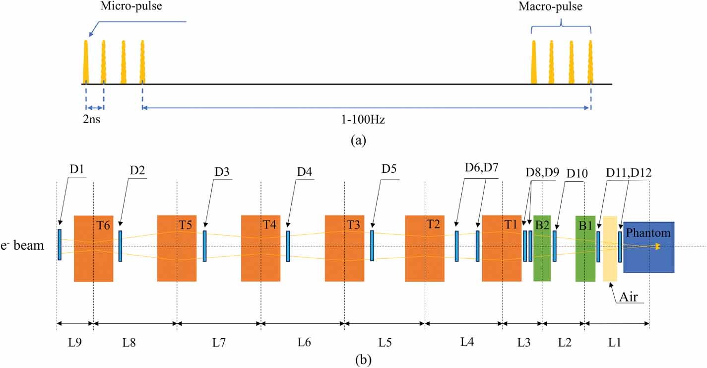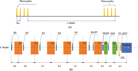 2.1. Electron beam parametersThe WALS linear accelerator uses a photoinjector to produce the beam (Dai et al 2023), and the LINAC is able to provide VHEE beams with an energy of 250 MeV and even higher. This enables research on the use of focused VHEE beams for radiation therapy of deep-seated tumors. The extracted electron beam parameters are shown in table 1, and the application platform is designed based on the input parameters. The temporal structure of the beam is shown in figure 1(a).