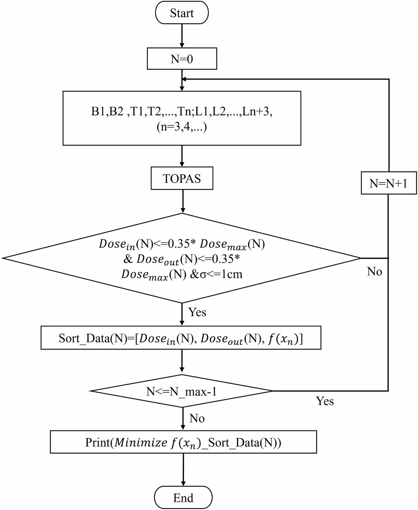 2.3. Program for focused VHEE scanning irradiation of the target areaRadiation dose calculation has traditionally relied on algorithms of varying complexity, including convolution/superposition methods and Monte Carlo simulations (Zheng et al 2025). The TopasOpt (Whelan et al 2023) code was further developed by embedding the optimization program within the NelderMeadOptimizer (Chang and Chang 1996), as shown in figure 2. The optimization parameters include the magnetic field gradients of the deflection magnets B1 and B2, the magnetic field gradients of quadrupole magnets T1 to Tn, and the distances between components L1 to Ln + 3. The Monte Carlo code TOPAS (Perl et al 2012) is then executed.