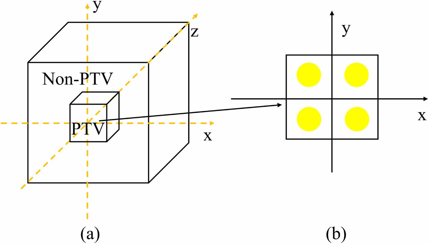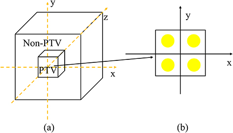 is defined within the longitudinal depth range of 12 cm–17 cm in the water phantom. The remaining regions of the water phantom are designated as Non-PTV. Four target points were placed as shown in figure 3, with their center positions located at (−1.5 cm, −1.5 cm), (−1.5 cm, 1.5 cm), (1.5 cm, −1.5 cm), and (1.5 cm, 1.5 cm), respectively. The treatment plan is based on typical geometries and dose measurement parameters used for SFRT with photons (Wu et al 2020, Zeng et al 2025).