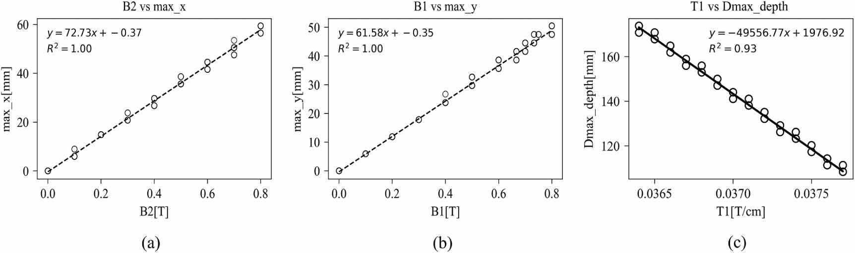 Figure 4. Linear fits between magnetic field parameters and dose position metrics. (a) B2 vs x-direction maximum dose position (max_x): y = 72.73x–0.37, R2 = 1. (b) B1 vs y-direction maximum dose position (max_y): y = 61.58x–0.35, R2 = 1. (c) T1 vs depth of maximum dose (Dmax_depth): y = −49 556.77x + 1976.92, R2 = 0.93.