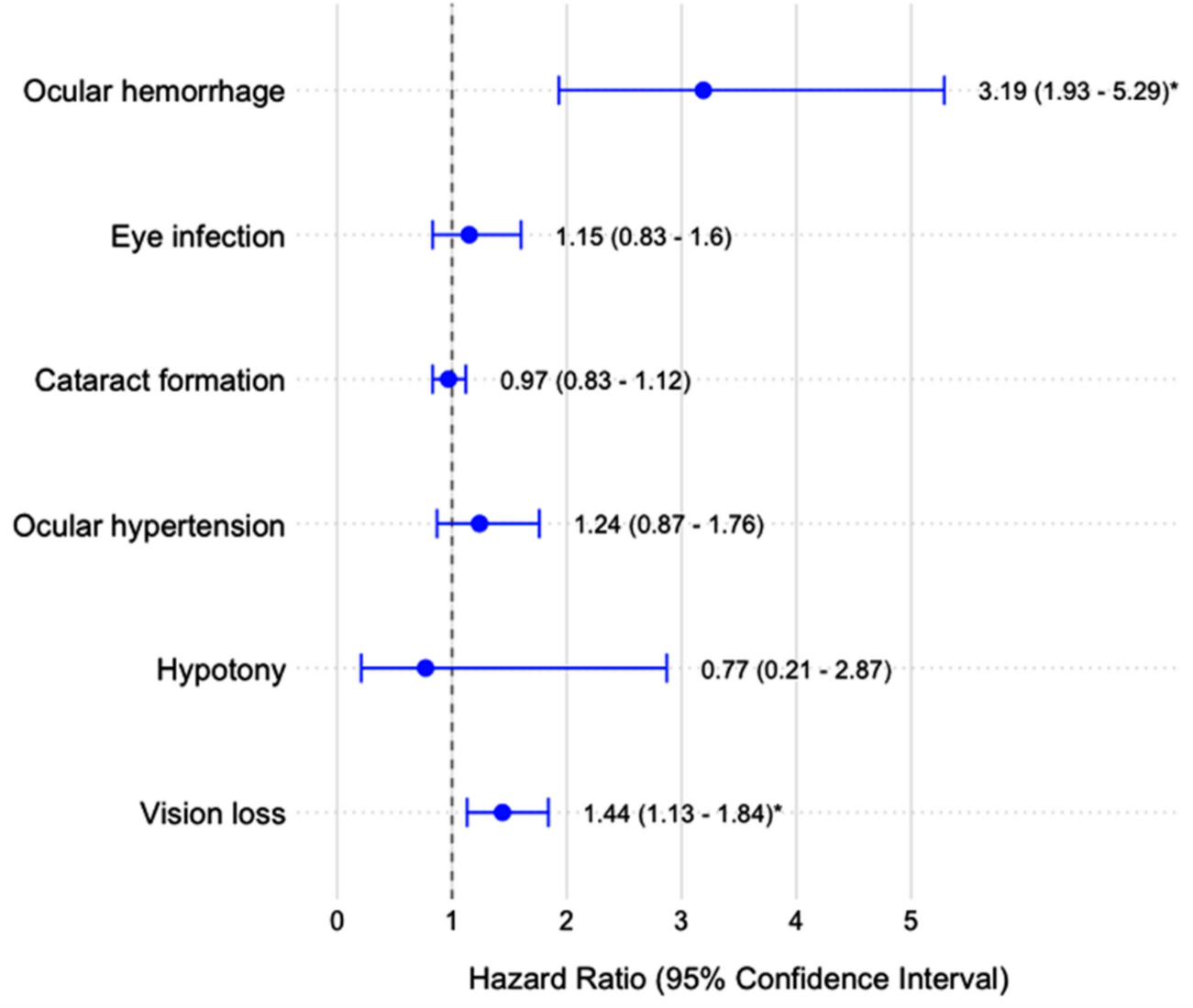 The threefold increase in the risk of any ocular hemorrhage among DR patients (HR 3.194, 95% CI 1.929–5.288) is a strong finding that may also have contributed to the higher risk of vision loss in this patient cohort. This is not surprising given that post-operative hemorrhagic events in general occur in the majority of cases, depending on the specific procedure [31]. We describe ocular hemorrhage as either retinal, conjunctival, vitreous, or choroidal. Although hyphema, or anterior chamber hemorrhage, is a common type of ocular hemorrhage after MIGS, we did not include it as a study outcome. It can be difficult to distinguish post-operative hyphema with or without concomitant clot formation, especially among patients with DR who are more vulnerable to such neovascular complications than those without DR. Indeed, those with clot formation may experience greater post-operative intraocular pressures and higher reoperation rates, prolonging resolution times [32]. Unfortunately, we were unable to assess the incidence of clot formation in the DR and non-DR cohorts, which may limit the utility of assessing hyphema incidence. This is indeed a limitation of a retrospective cohort study utilizing an administrative database, and thus requires future trials to assess the incidence and resolution periods of hyphema with and without clot formation.