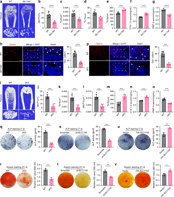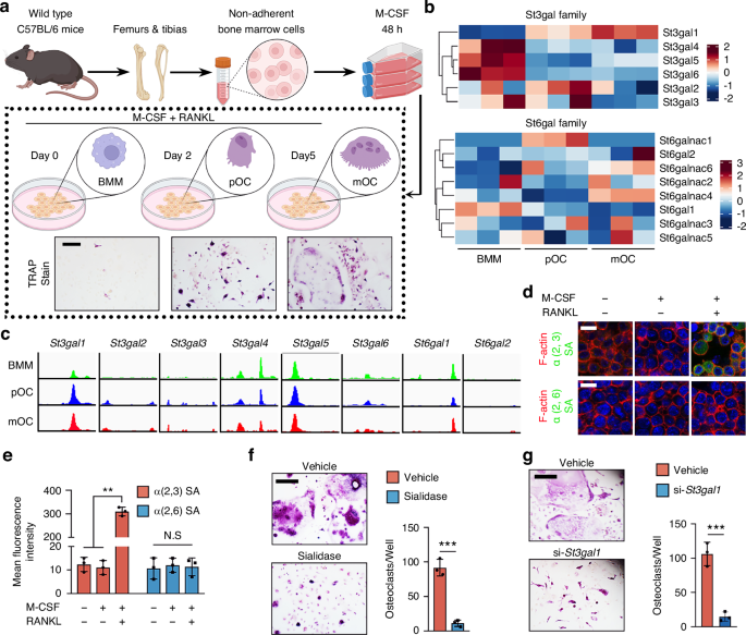 Immunohistochemistry, immunofluorescence, and histomorphometryFemurs were collected, fixed in 4% paraformaldehyde overnight, and decalcified in 10% EDTA (pH 7.4) for 21 days. Samples were dehydrated in 30% sucrose for 24 h and embedded in paraffin or optimal cutting temperature compound (Sakura Finetek). Four-micrometer-thick coronal sections were prepared for hematoxylin and eosin staining. For immunostaining, femurs were fixed for 4 h in 4% paraformaldehyde, decalcified in 0.5 mol/L EDTA at 4 °C for 24 h, and dehydrated in 20% sucrose and 2% polyvinylpyrrolidone (PVP) for 24 h before embedding in 8% gelatin. Forty-micrometer-thick coronal sections were processed for immunostaining using primary antibodies against ST3GAL1 (1:50) and TRAP (1:100) at 4 °C overnight. Immunohistochemical detection was performed with a horseradish peroxidase-streptavidin kit, followed by hematoxylin counterstaining. Sialic acid detection was performed using biotinylated Maackia amurensis lectin II (MAL II) to detect α2,3-linked sialic acids and Sambucus nigra lectin (SNA) to detect α2,6-linked sialic acids, followed by fluorescein-conjugated streptavidin for signal visualization. Imaging was conducted using a Zeiss LSM 780 confocal or Olympus BX51 microscope, and quantitative histomorphometry was performed using OsteoMeasure XP software in a blinded manner.