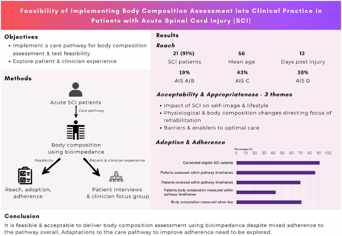 ParticipantsAll patients >18 years with a new traumatic-SCI admitted between May 2023-January 2024 were eligible. Patients were excluded if they had a pacemaker, were pregnant or breastfeeding, in ICU or had a concurrent severe acquired brain injury (post-traumatic amnesia duration >7 days). Eligible patients were approached and gave verbal consent to receive clinical care, as per the care pathway. Twenty-one participants undertook individualised rehabilitation as per Clinical Practice Guidelines [16] and 30–60-min of exercise training (supported by an EP) 2–3 days per week including weights and/or wheelchair skills except for 3 patients who were also participants in an intensive rehabilitation trial. All patients received the diet prescribed by their treating dietitian. BIS measurements were scheduled on patient rehabilitation timetables. Individualised body composition feedback to patients was integrated into face-to-face dietitian reviews or goal setting and healthy lifestyle counselling delivered by the dietitian and/or EP.