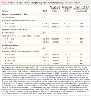 From immunization records, we identified residents who had received at least one dose of mRNA vaccine as of February 15, 2021; those who had received both doses by February 15, 2021; and those who were present at their facility on the day of the first vaccination clinic but who were not vaccinated as of March 31, 2021. We identified incident SARS-CoV-2 infections through March 31, 2021, on the basis of polymerase-chain-reaction assay and antigen-test records. Residents were tested every 3 to 7 days when there were confirmed cases in their facility and were tested if they had any new symptoms or potential exposure. Residents who had been infected in the 90 days before the study window were excluded. We counted incident infections after receipt of each dose among vaccinated residents and after the date of the first vaccination clinic among unvaccinated residents. Nurses assessed residents daily and documented new symptoms in structured change-in-condition notes. From these notes, we deemed residents to be symptomatic if SARS-CoV-2–related symptoms developed during the period from 5 days before to 14 days after a positive test. Detailed methods are described in the Supplementary Appendix, available with the full text of this letter at NEJM.org.