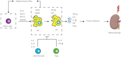 THERAPEUTIC IMPLICATIONS OF TARGETING CD8+ T CELLS IN ADIPOSE TISSUE IN DKDThe change of the microenvironment in diabetes brings about cellular alterations in adipocytes, and affects the cross-talk between adipose tissue and other organs, including the kidney, referred to as the adipo–renal axis164. Plenty of evidence has shown that obesity might be a risk factor for ESKD in people with type 2 diabetes and hypertension165-168. In people with DKD and obesity who had an eGFR <40 mL/min/1.73 m2 and urine albumin excretion <30 mg/day, a short-term intensive ketogenic diet improved their glomerular filtration rate, as well as metabolic markers, including fasting insulin, fasting glucose and insulin resistance, which shows that alteration in adipocytes might be a contri