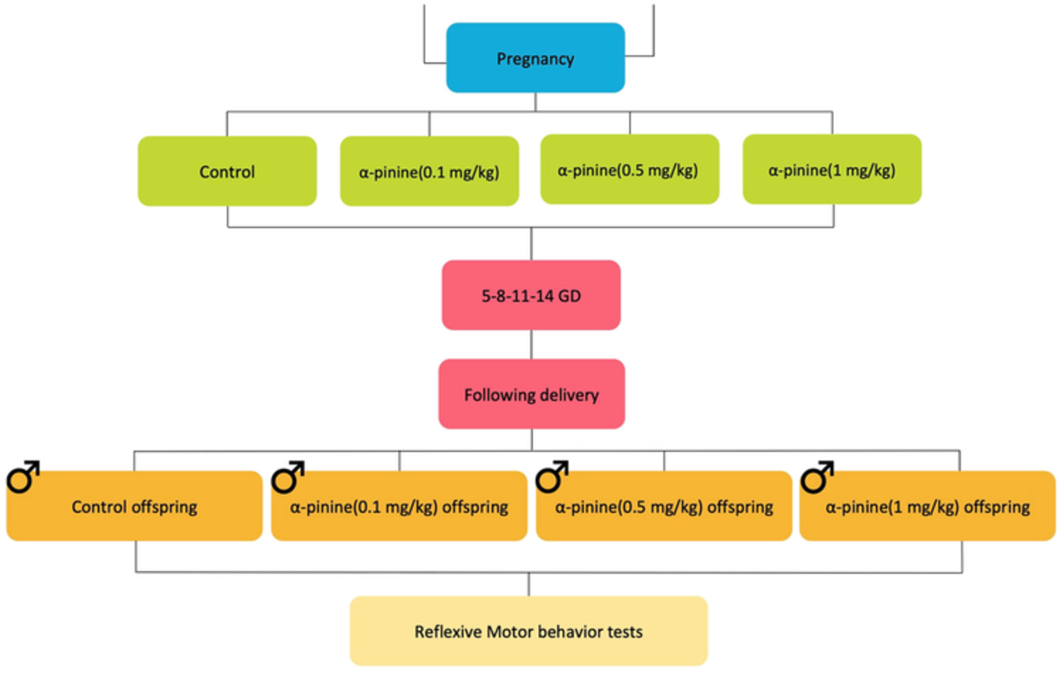 α-pinene is a well-known compound representative of the monoterpenes group with a wide range of pharmacological activities. This article aims to determine effects of the prenatal exposure to α-pinene on reflexive motor behaviours in mice offspring. Forty pregnant female NMRI mice (8–10 weeks old) were allocated into four groups. Group 1 served as control and groups 2–4 were intraperitoneally (i.p.) injected α-pinene (0.1, 0.5 and 1 mg/kg) on 5, 8, 11, 14 and 17 days of gestation (GD). The control group was injected with saline at the same days. Following delivery, 20 pups from each litter were selected and reflexive motor behaviours determined using ambulation, hindlimb foot angle, surface righting, hindlimb strength, grip strength, front-limb suspension and negative geotaxis tests. Based on the findings of the present study, maternal exposure to α-pinene increased ambulation score, hind-limb suspension score, grip strength, front-limb suspension compared with the control group (P < 0.05). Also, prenatal exposure to α-pinene decreased surface righting, hind-limb foot angle and negative geotaxis in mice offspring compared with the control group (P < 0.05). α-pinene (0.1, 0.5 and 1 mg/kg) decreased blood MDA and increased SOD and GPx levels in mice offspring (P < 0.05). These results suggested α-pinene exposure during pregnancy has positive effect on reflexive motor behaviours in mice offspring possibly due to its antioxidant properties.