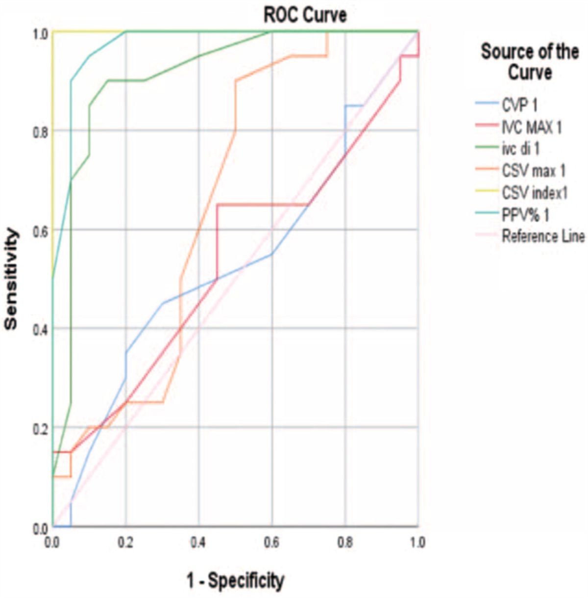 In our study, the baseline the CSV index, its sensitivity and specificity were 95% in prediction of fluid responsiveness at a cut off 11.5. The baseline PPV, its sensitivity was 95% and specificity was 90% in prediction of the fluid responsiveness at a cut off 14%. The baseline IVC di, it can predict the response to fluid by sensitivity 85% and specificity 90% at a cut off 14.5%.