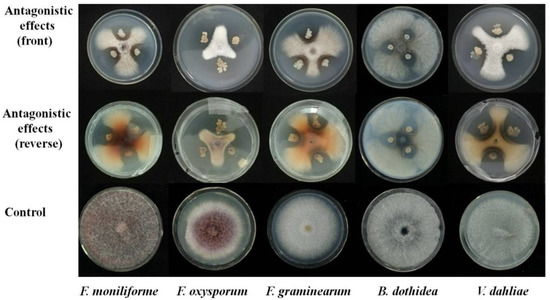 2. Materials and Methods 2.1. MaterialsFungal pathogens were provided by the key laboratory of plant–microbe interactions of Henan province, China, including V. dahliae, Botryosphaeria dothidea, F. graminearum, F. verticillioides, and F. oxysporum. Carbendazim was purchased from Sichuan Guoguang Agrochemical Co., Ltd.