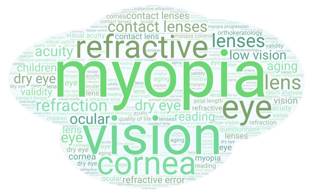 FIGURE 1: Frequency word count of most common article indexing keywords from the top 25 articles with greatest scientific citations published in Optometry and Vision Science between 1923 and 2023. Word size is proportional to word frequency.