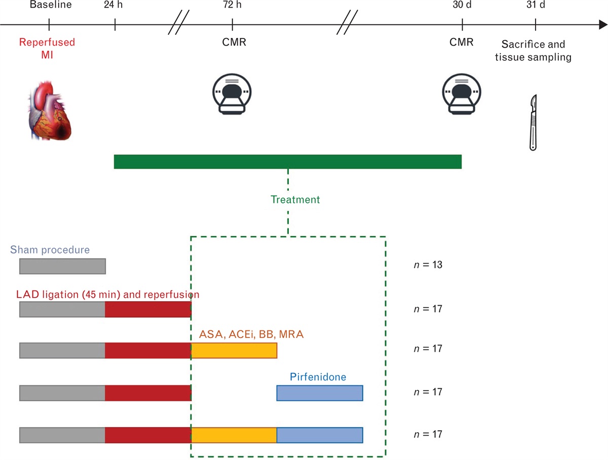 MethodsMale Wistar rats were randomized to: sham procedure (n = 13), reperfused MI-induced by ligating the left anterior descending artery (LAD) for 45 min (n = 17), reperfused MI plus standard therapy (aspirin, angiotensin-converting enzyme inhibitor, beta blocker, and mineralocorticoid receptor antagonist) (n = 17), reperfused MI plus pirfenidone alone (n = 17), or reperfused MI plus standard therapy and pirfenidone (n = 17). Rats surviving MI induction underwent cardiac magnetic resonance scans after 72 h and 30 days from MI, and were sacrificed on day 31.